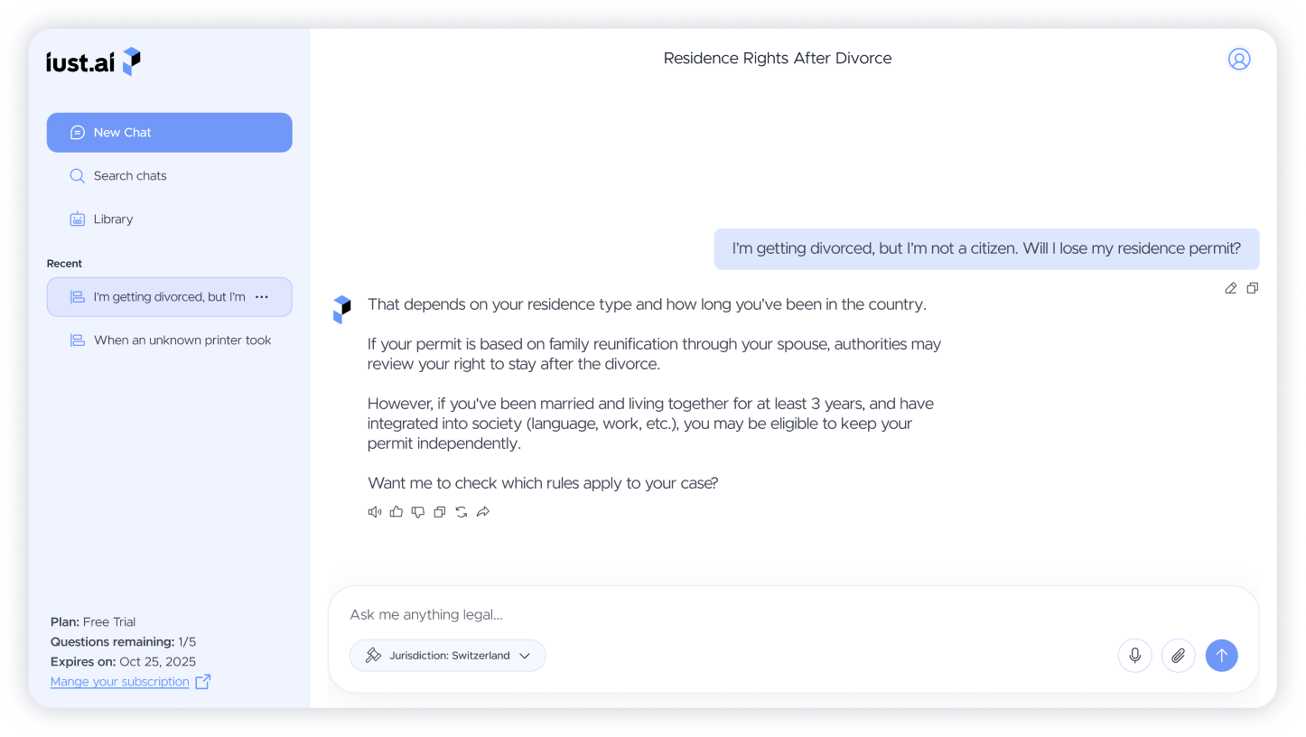 Hiring a lawyer for simple legal issues can be expensive. iust.ai gives you affordable-and often free-access to legal information and support. Use your free questions to get started, and only pay if you need deeper insights or personalized follow-ups.